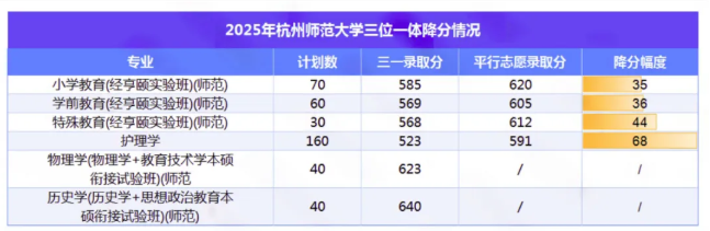 2025年杭州师范大学三位一体录取分数线最低是523分,对应护理学专业。