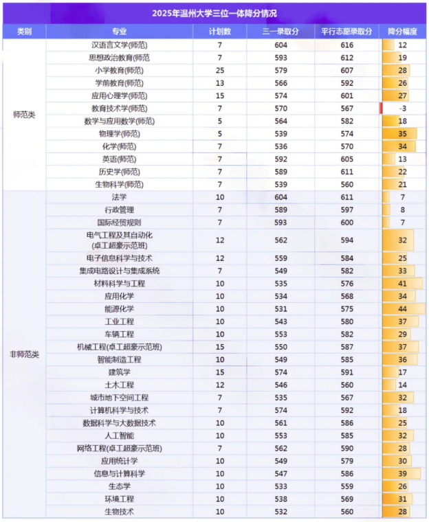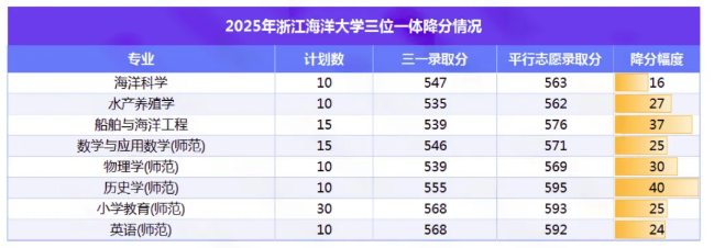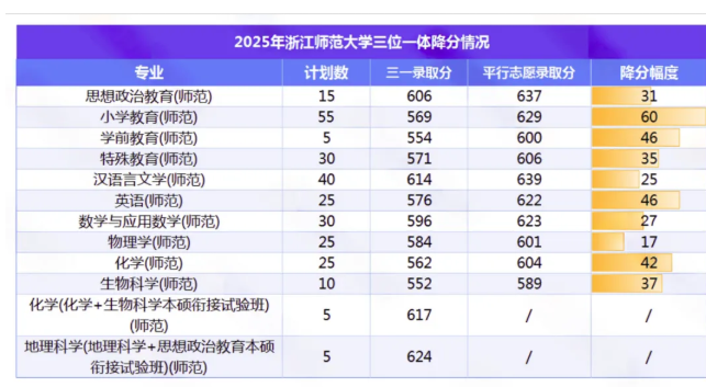 2025年浙江师范大学三位一体录取分数线:小学教育569分、思想政治教育606分、化学专业562分、汉语言文学614分等。