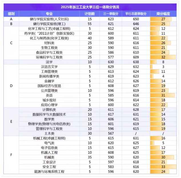 2025年浙江工业大学三位一体录取分数线是567分到630分之间,分数最低是土木类、分数最高是法学。