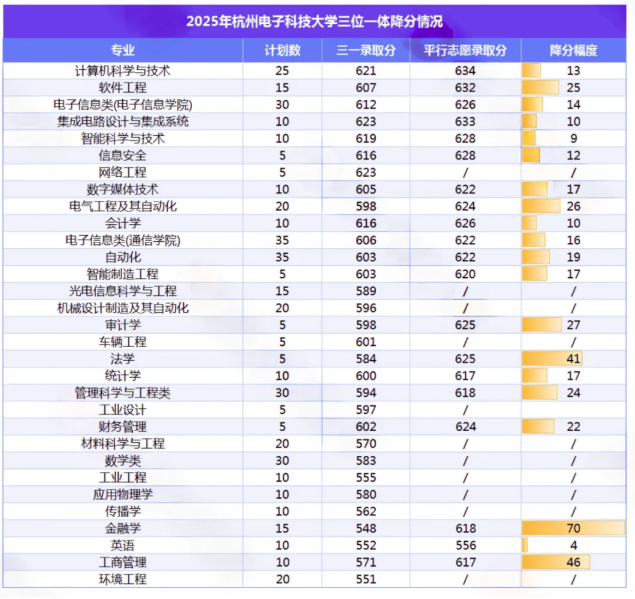 2025年杭州电子科技大学三位一体录取分数线最高的专业是计算机科学与技术(621分)、最低的专业是金融学(548分)。金融学专业相比2025年普通批录取分数线,下降了70分录取,报考性价比非常高。