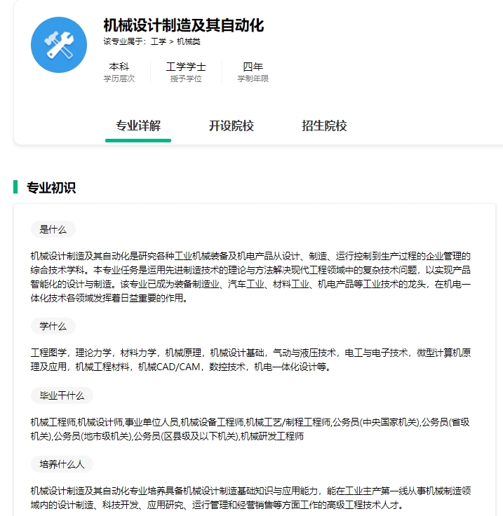 是什么:这是研究各种工业机械装备及机电产品从设计、制造、运行控制到生产过程的企业管理的综合技术学科。本专业任务是运用先进制造技术的理论与方法解决现代工程领域中的复杂技术问题,以实现产品智能化的设计与制造。该专业已成为装备制造业、汽车工业、材料工业、机电产品等工业技术的龙头,在机电一体化技术各领域发挥着日益重要的作用。