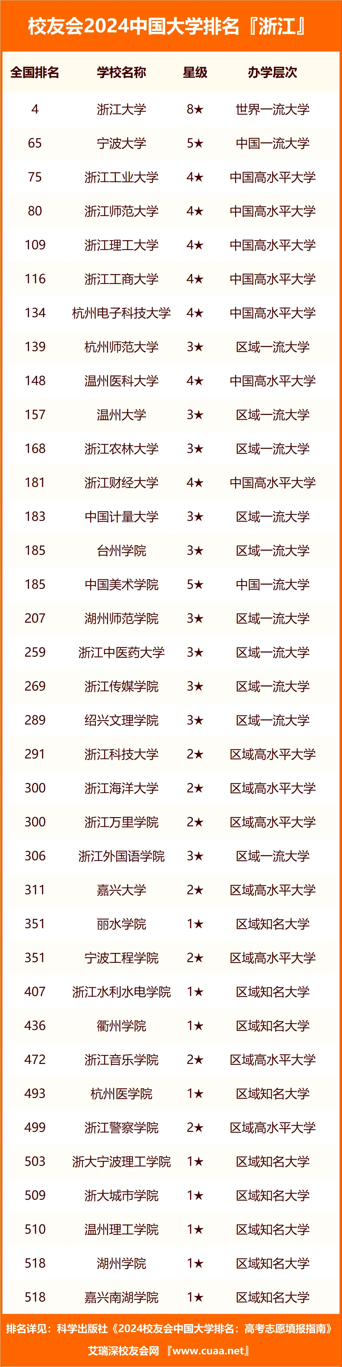 以下为2024年校友会浙江省公办本科大学排名,各位浙江省的同学和家长可作为参考。