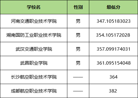 而推荐高分考生报考的院校有成都航空职业技术学院(382分)、长沙航空职业技术学院(364分)、武昌职业学院(361分)等。