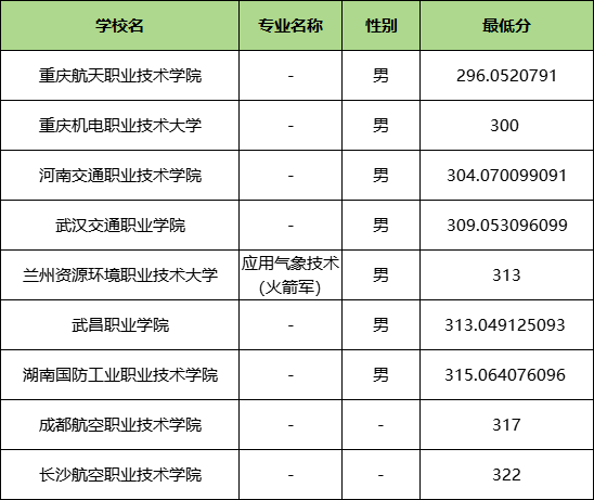 而推荐高分考生报考的院校有长沙航空职业技术学院(322分)、成都航空职业技术学院(317分)、湖南国防工业职业技术学院(315分)等。