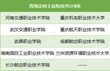 2024年在青海招定向士官的院校共有9所,包括重庆航天职业技术学院、成都航空职业技术学院、兰州资源环境职业技术大学等。