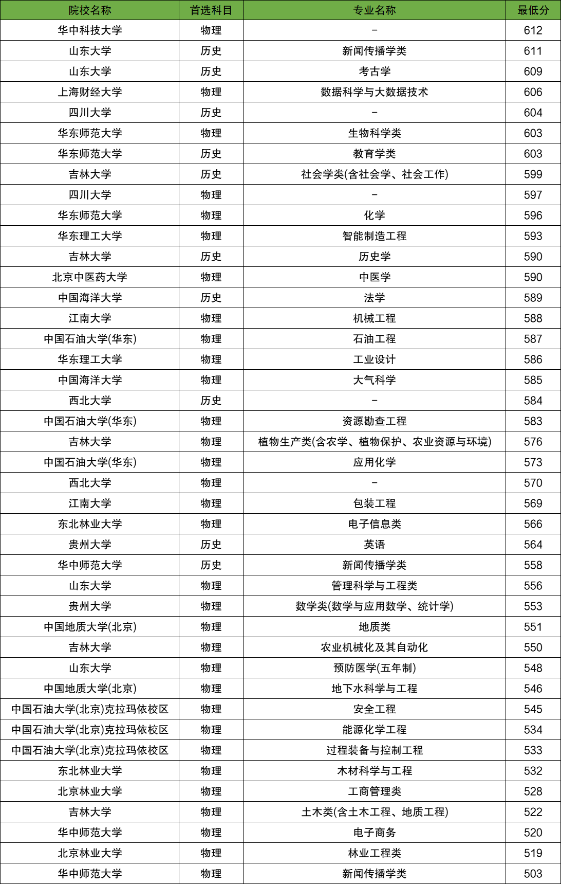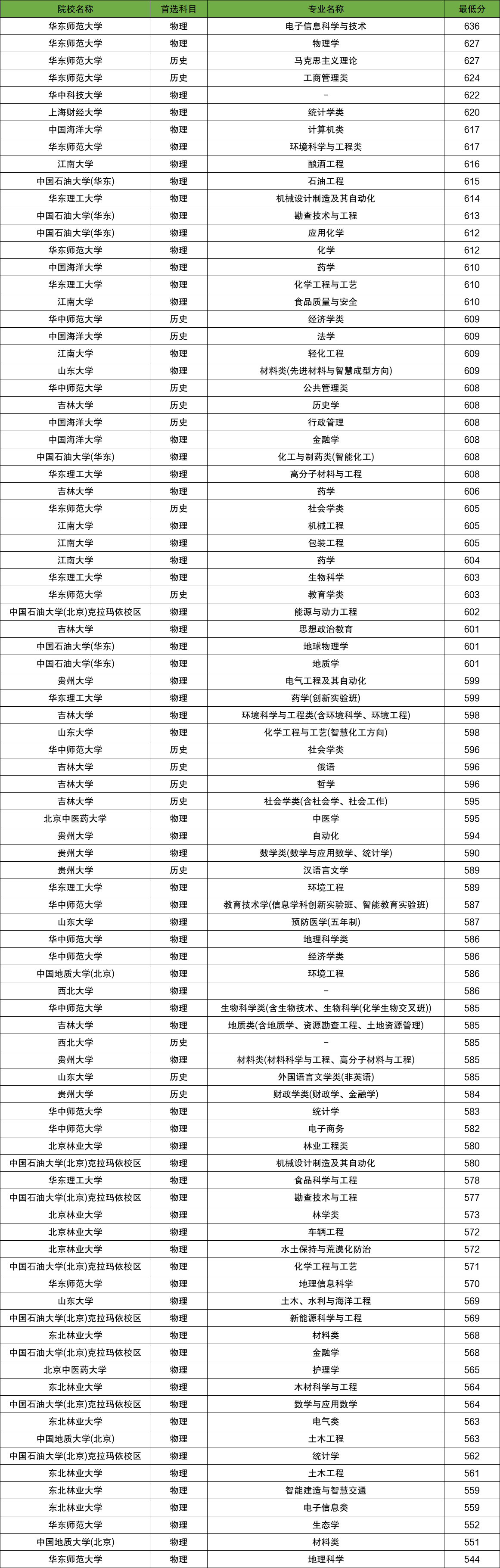 物理类:电子信息科学与技术636分、物理学627分、生态学552分