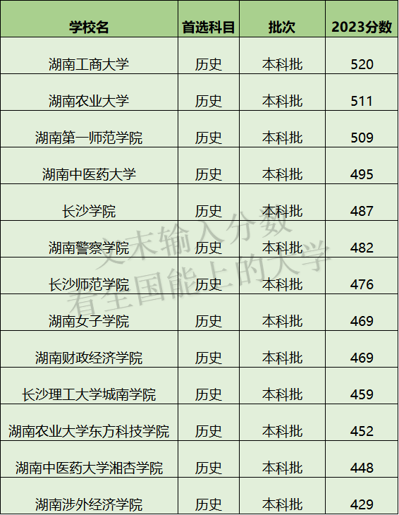 在长沙市历史类中,长沙市所有二本大学分数最高最难考的大学为湖南工商大学、湖南农业大学、湖南第一师范学院、湖南中医药大学、长沙学院,对应最低分数为520分、511分、509分、495分、487分。