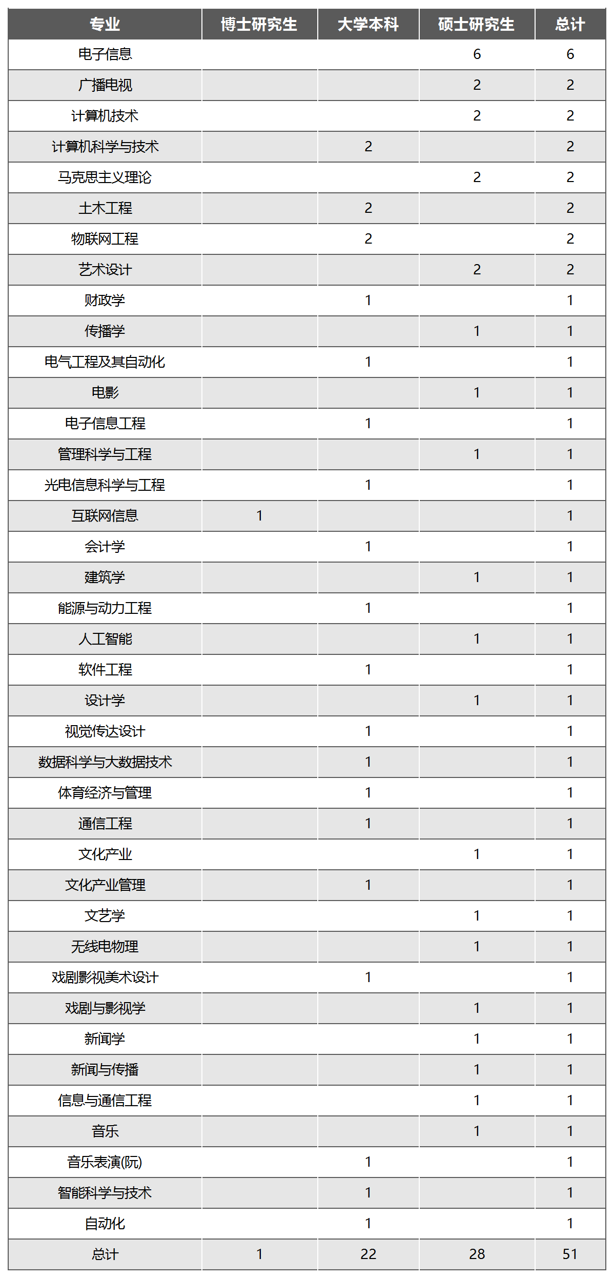 根据国家广电总局发布的《2023年度拟接收高校毕业生情况公示》可知,2023年广电局招录高校毕业生51人,其中硕士研究生28人、博士研究生1人、本科22人。