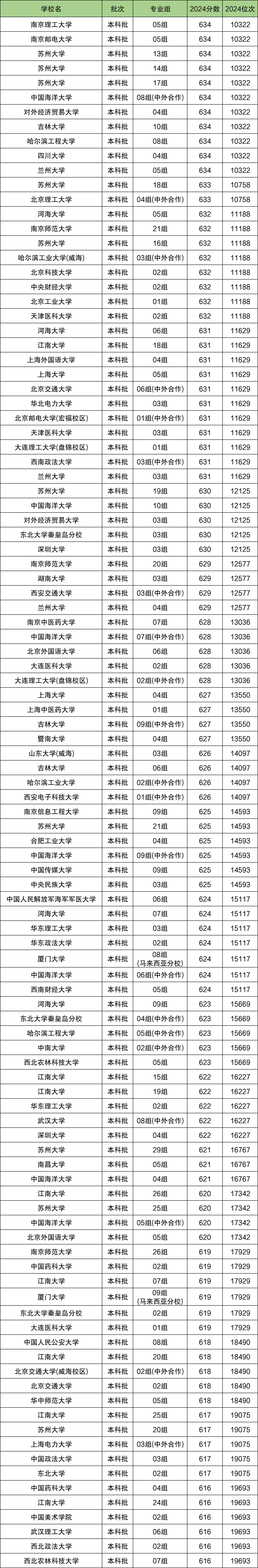 下表为2024年在江苏物理类中分数位次在1万-2万名的全部大学。
