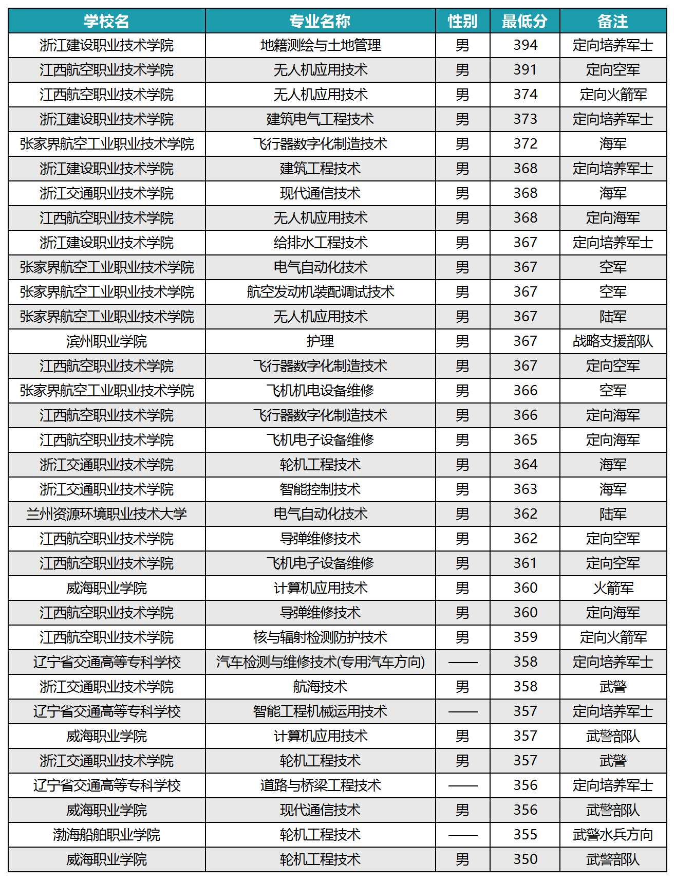 2023年定向士官学校在理科的分数线集中在350分到394分之间。