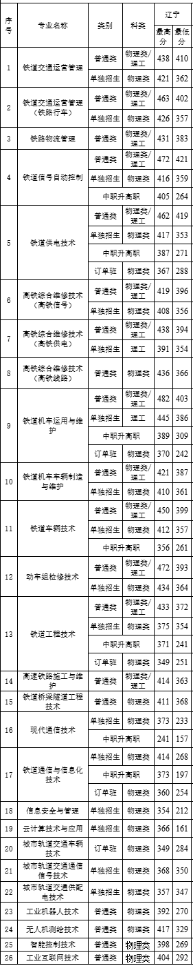 5、辽宁铁道职业技术学院:普高类最低233分、中职类最低157分。
