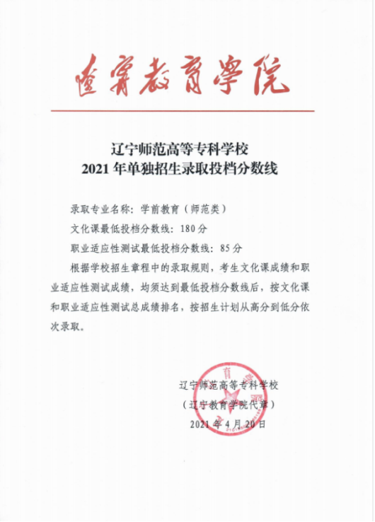 4、辽宁师范高等专科学校:文化课最低分180分、职业适应性测试最低分85分。