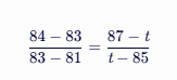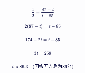 假设某考生化学科目的原始成绩为83分,全省同选科考生中,原始成绩在84-81分之间的考生被划分到某一赋分区间(假设为87-85分)。那么,可以将83分、84分(s2)、81分(s1)、87分(t2)和85分(t1)代入公式进行计算: