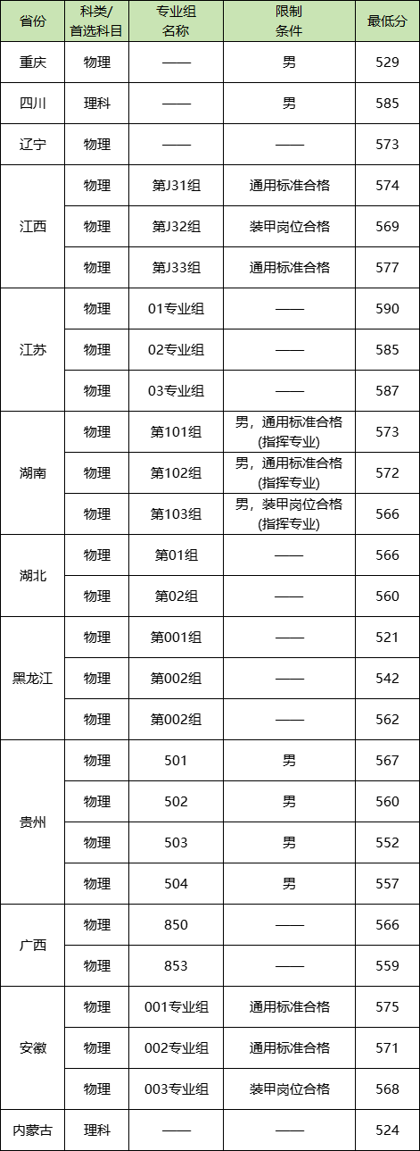 陆军步兵学院在各地区的分数线为本科提前批线:四川理科585分、辽宁物理类573分等,更多分数线请见下文。