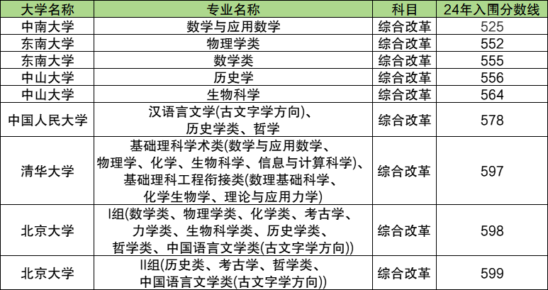 6、北京大学:598分,强基计划最低分专业为I组(数学类、物理学类、化学类、力学类、生物科学类、历史学类、考古学、哲学类、中国语言文学类(古文字学方向))。