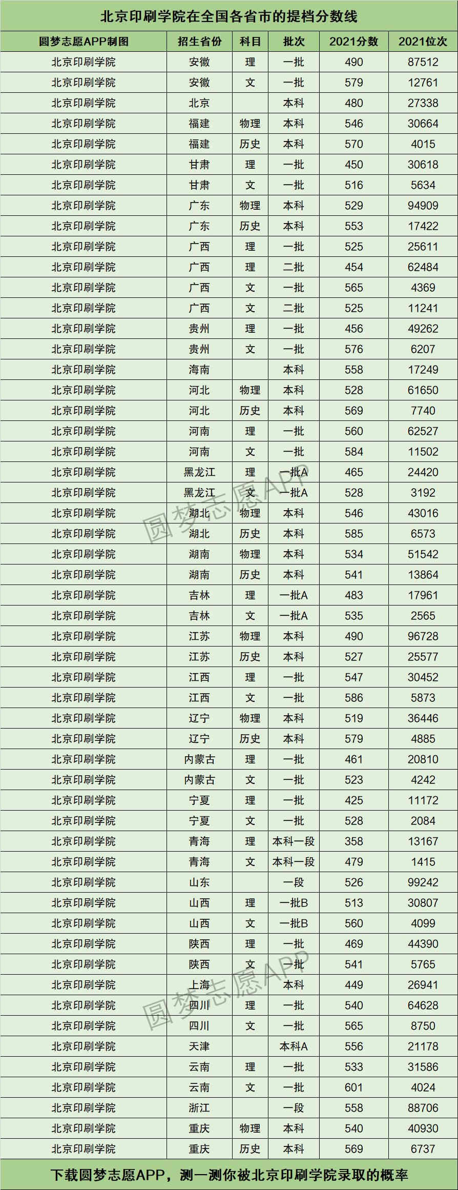一、北京印刷学院提档线2021年 北京印刷学院位于北京市,所以小编先为大家单独列出了北京印刷学院在北京市2021年的提档分数线。 北京印刷学院在本科批的最低提档线为480分,最低位次为27338名。 如果你想查看:北京印刷学院各专业——近三年的录取分数线和位次。请直接在手机应用市场下载圆梦志愿APP,获取资料。 二、北京印刷学院调档比例 本文将以北京印刷学院2021年本科招生章程为依据,为大家提供北京印刷学院的调档比例。 学校在实行平行志愿的省份(自治区、直辖市)调阅考生档案的比例原则上为105%以内。学校按照教育部要求预留一定计划,预留计划使用的基本原则是投放到生源相对较好的省区,或用于平行志愿提档后考生录取。 三、北京印刷学院在全国各省市的提档线汇总 下图为具体的招录数据,同学们在参考时一定不能只看北京印刷学院的最低分,要重点对比北京印刷学院的最低录取位次↓