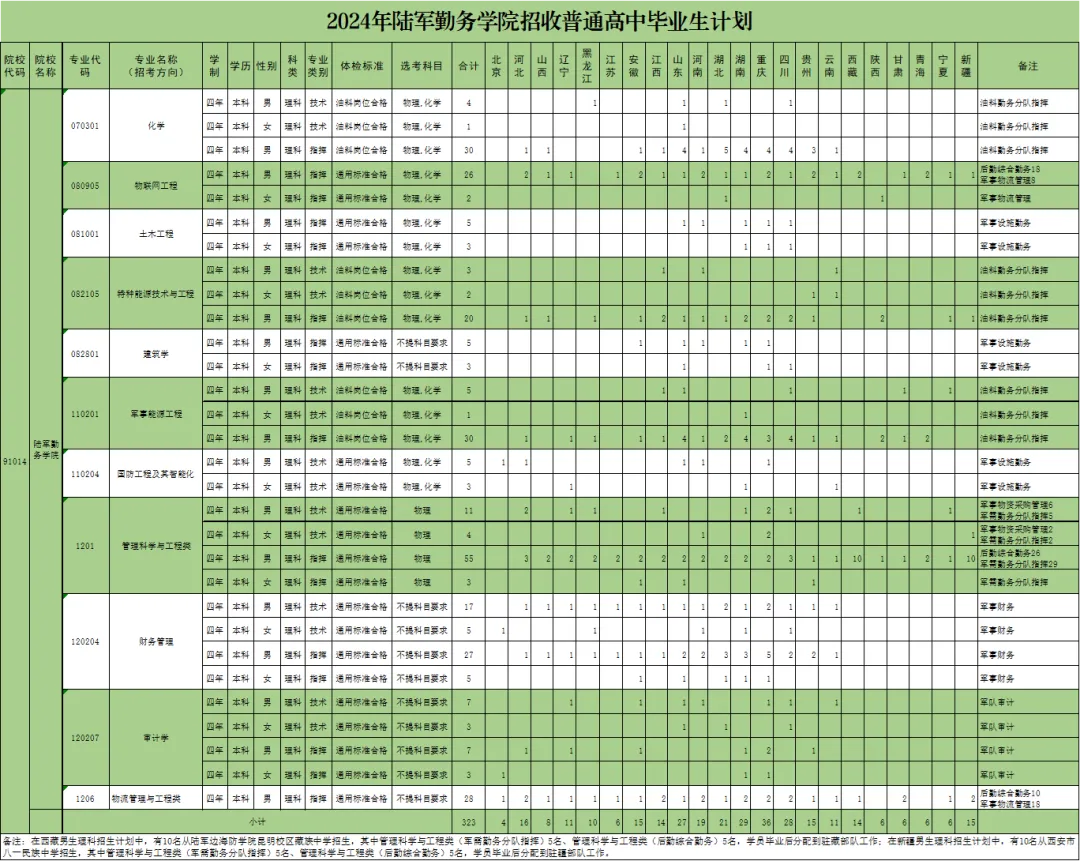陆军勤务学院招生简章已公布,2024招生计划323人,其中河北16人,招生专业包括化学、物联网工程、土木工程、特殊能源技术与工程、建筑学、军事能源工程、国防工程及其自动化等。