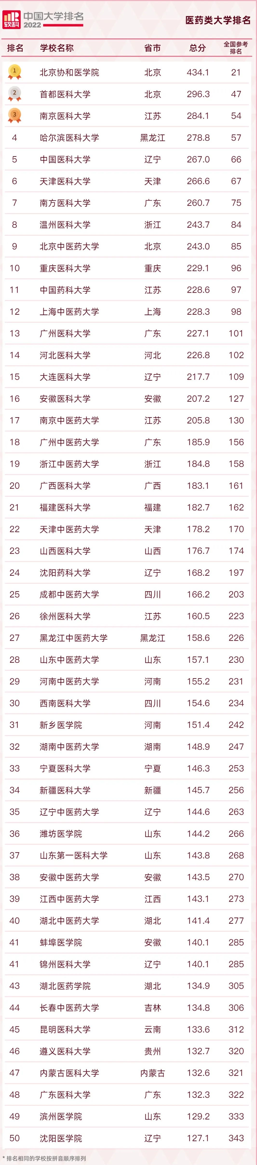 2022软科中国医药类大学排名的上榜高校有85所,北京协和医学院、首都医科大学、南京医科大学排名全国医药类大学前三名。