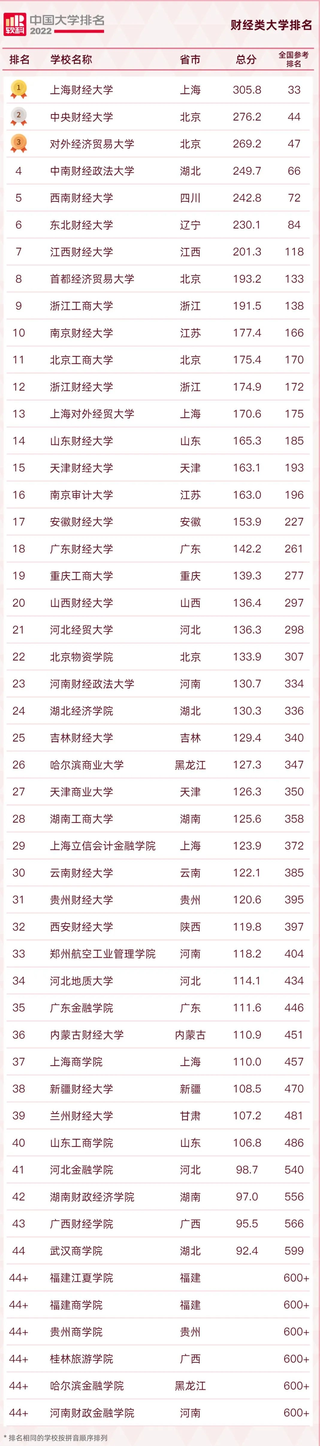 2022软科中国财经类大学排名的上榜高校有55所,上海财经大学、中央财经大学、对外经济贸易大学排名全国财经类大学前三名。