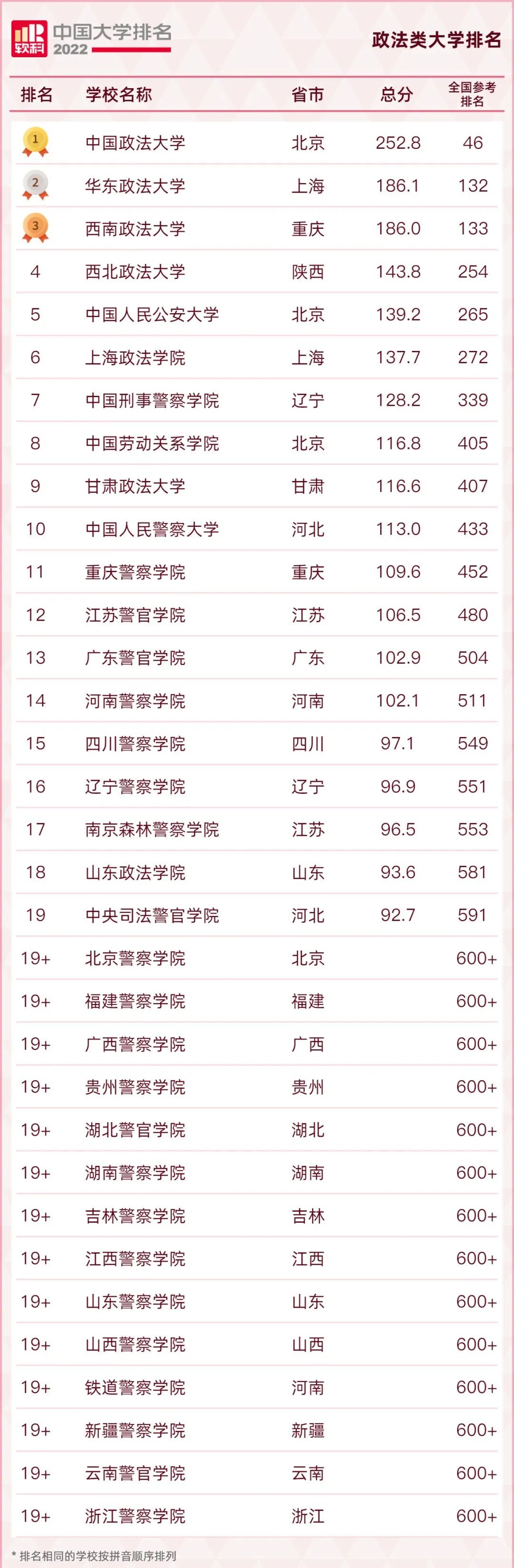 2022软科中国政法类大学排名的上榜高校有33所,中国政法大学、华东政法大学、西南政法大学排名全国政法类大学前三名。
