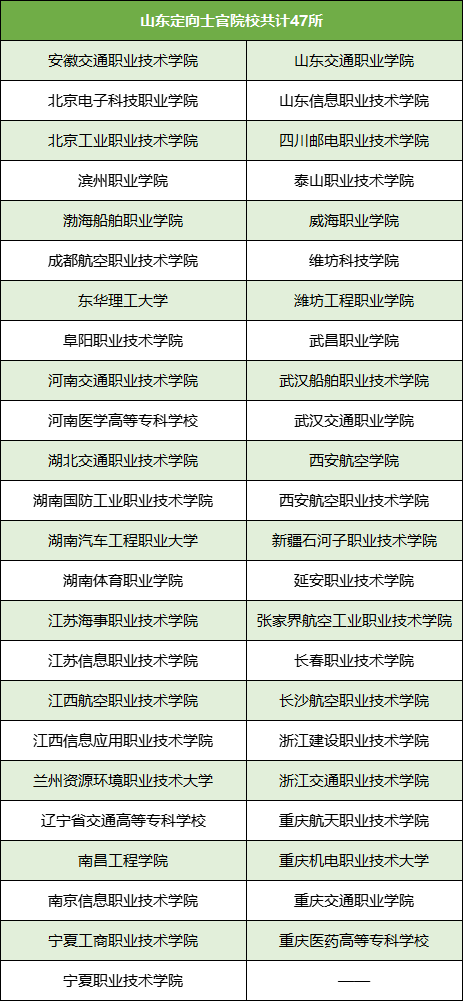 2024年在山东招定向士官的院校共有47所,包括滨州职业学院、山东信息职业技术学院、威海职业学院等。