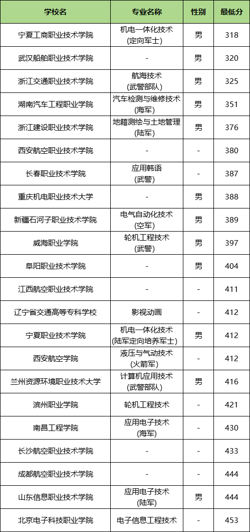 其中最好考的定向士官院校是宁夏工商职业技术学院,其机电一体化技术专业2024年最低录取分为318分。
