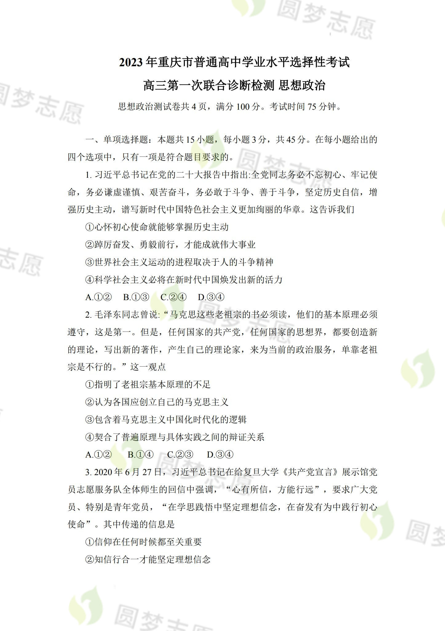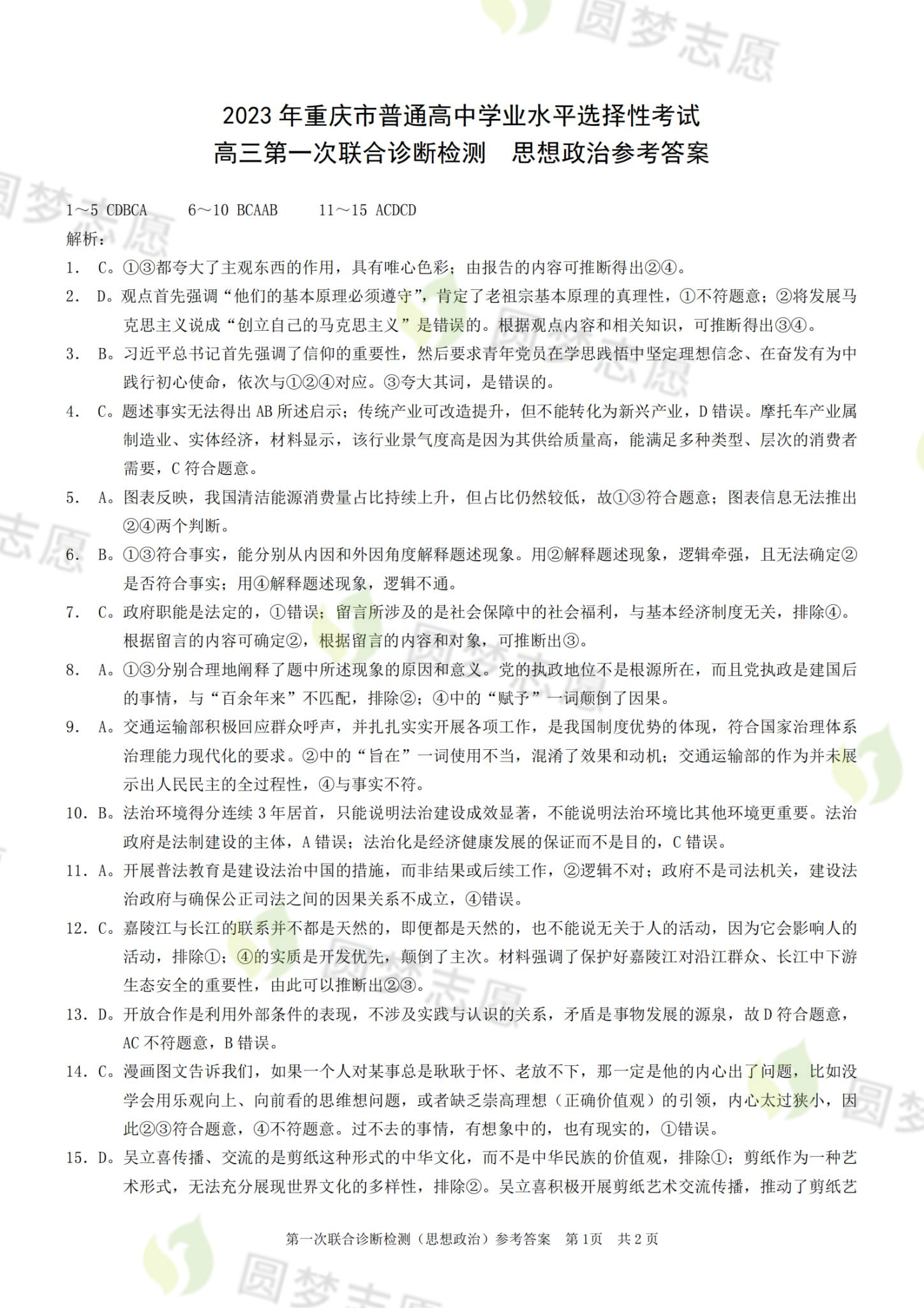 重庆一诊政治答案2023持续更新中,2023年重庆一诊考试将于1月8日开考,除九龙坡学校、渝中少量学校外重庆市下属所有区县均参加。本文为大家公布重庆康德卷一诊2023政治试卷真题以及参考答案解析,供参考。