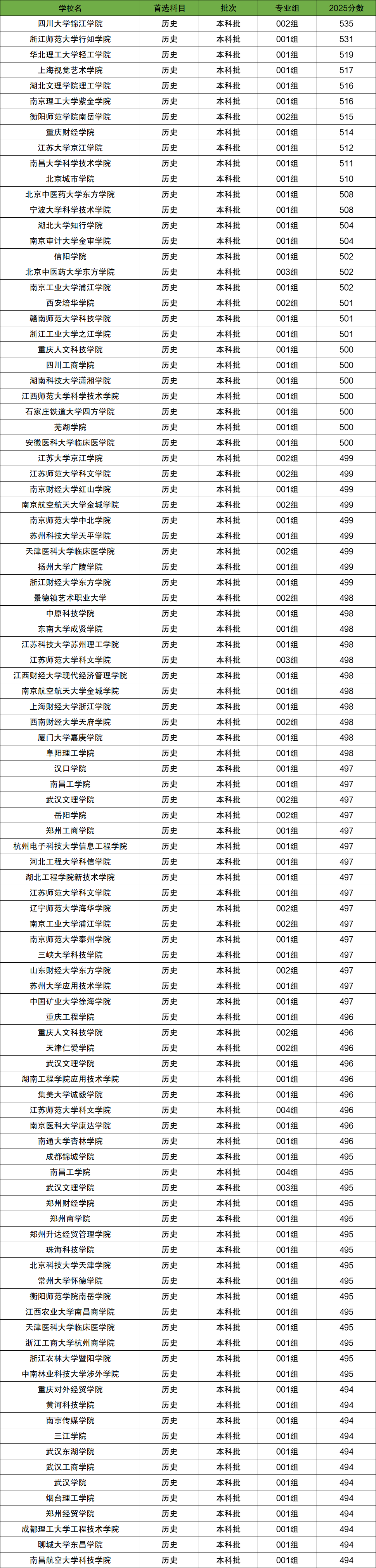 其中历史类分数最低的院校为吉林师范大学博达学院、陕西科技大学镐京学院、上海师范大学天华学院、安徽外国语学院、安徽文达信息工程学院等,最低分均为477分。而分数最高的院校为四川大学锦江学院,最高分为535分。