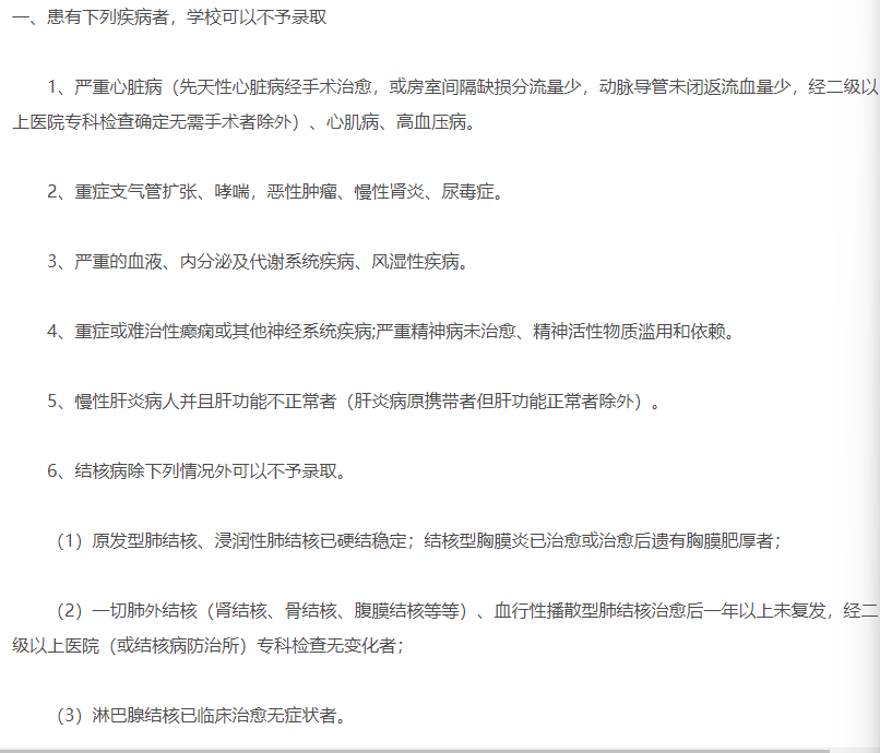除患有传染性疾病、精神性疾病、血液病、心脏病、高血压等无法完成学业的疾病及学习不能自理的考生,高等学校可以不予录取外,对患有其他疾病的考生,只要不影响专业学习和其他学生,录取时一般应不受限制。