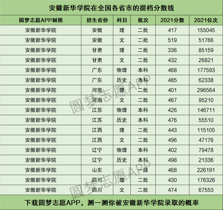 一、安徽新华学院提档线2021年 安徽新华学院位于安徽省合肥市,所以小编先为大家单独列出了安徽新华学院在安徽省2021年的提档分数线。 1、文科 安徽新华学院在本科二批的最低提档线为519分,最低位次为51766名。 2、理科 安徽新华学院在本科二批的最低提档线为417分,最低位次为155045名。 如果你想查看:安徽新华学院各专业——近三年的录取分数线和位次。请直接在手机应用市场下载圆梦志愿APP,获取资料。 二、安徽新华学院在全国各省市的提档线汇总 下图为具体的招录数据,同学们在参考时一定不能只看安徽新华学院的最低分,要重点对比安徽新华学院的最低录取位次↓