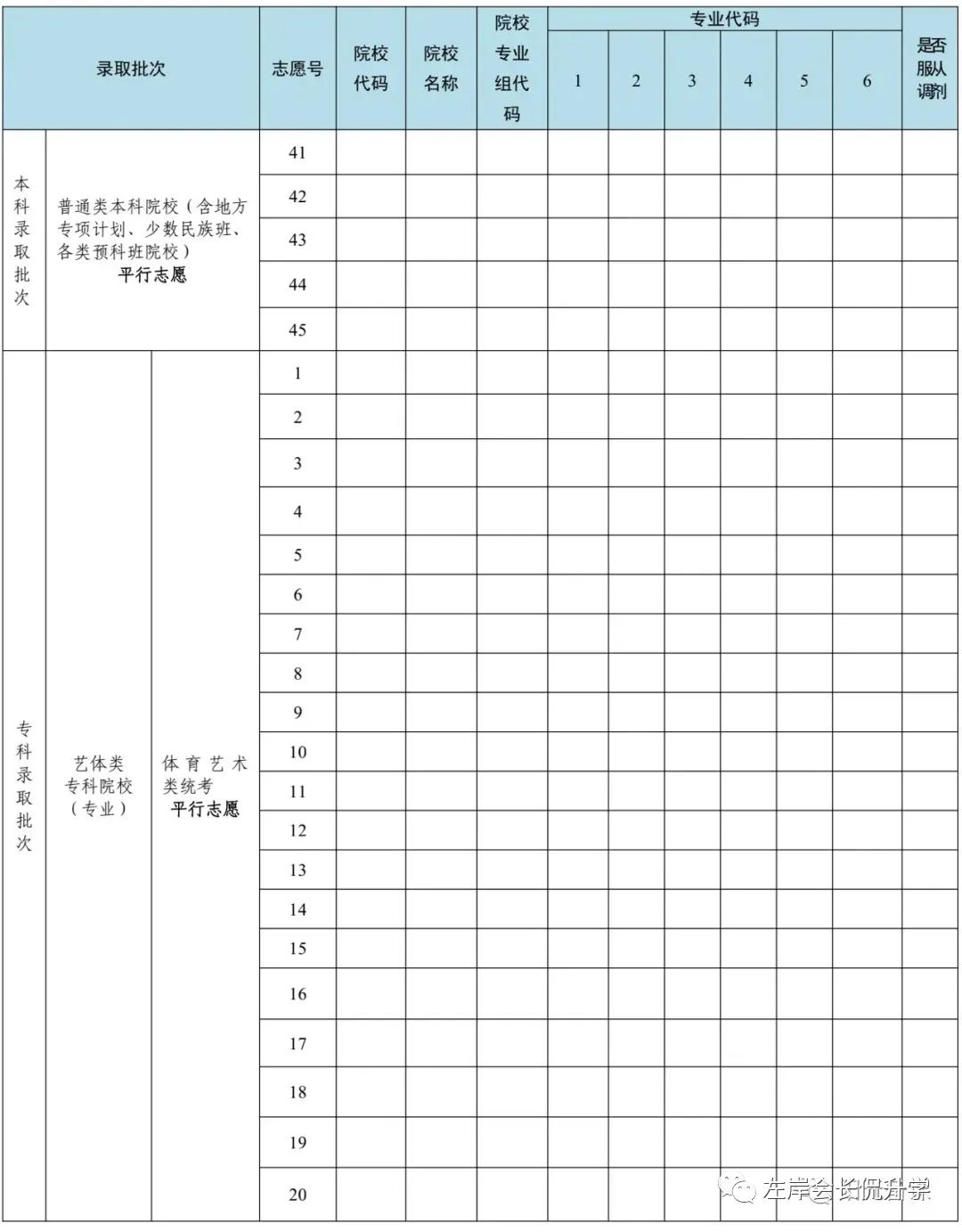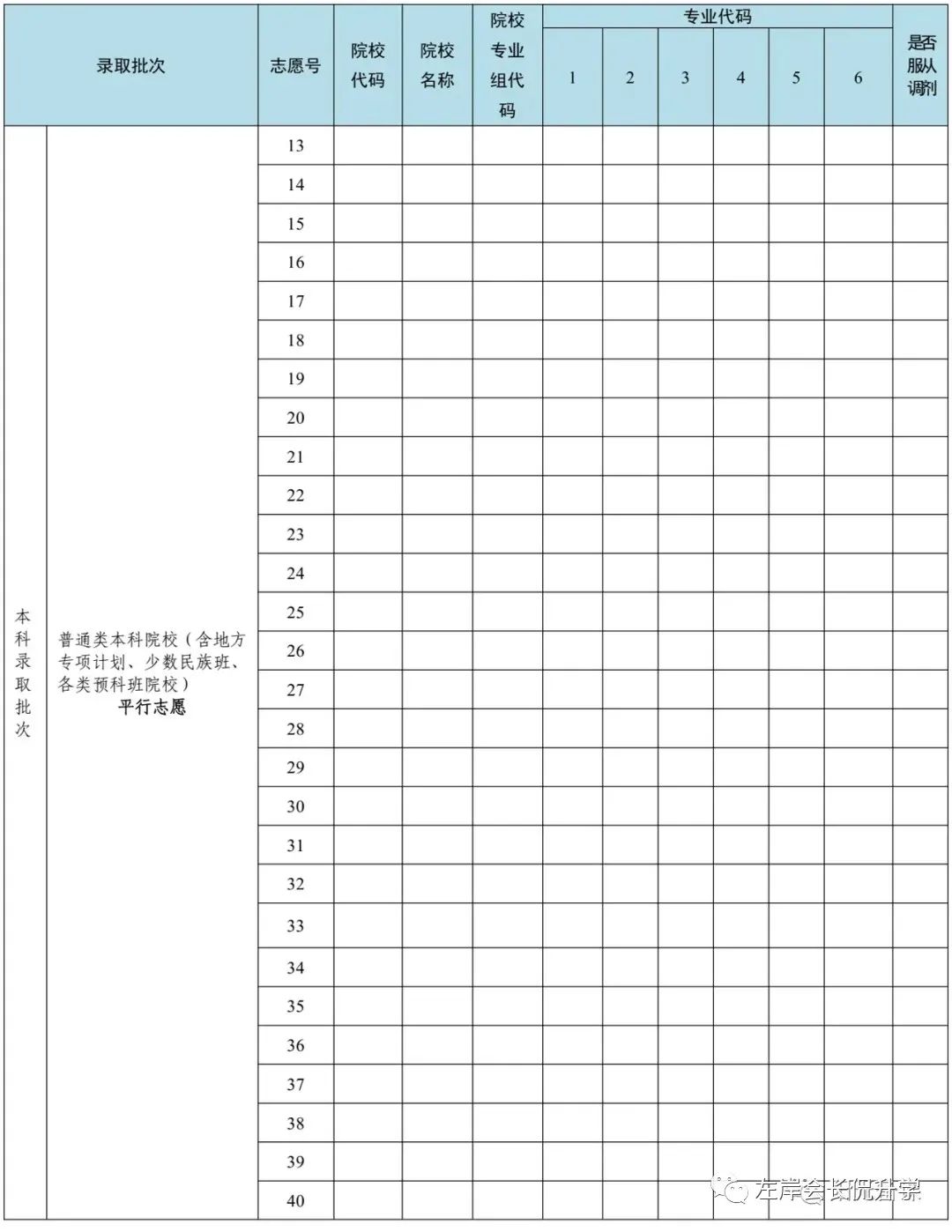 普通类本科批、普通类专科批均可填报40个志愿,本科和专科的每个志愿都可填报6个专业。