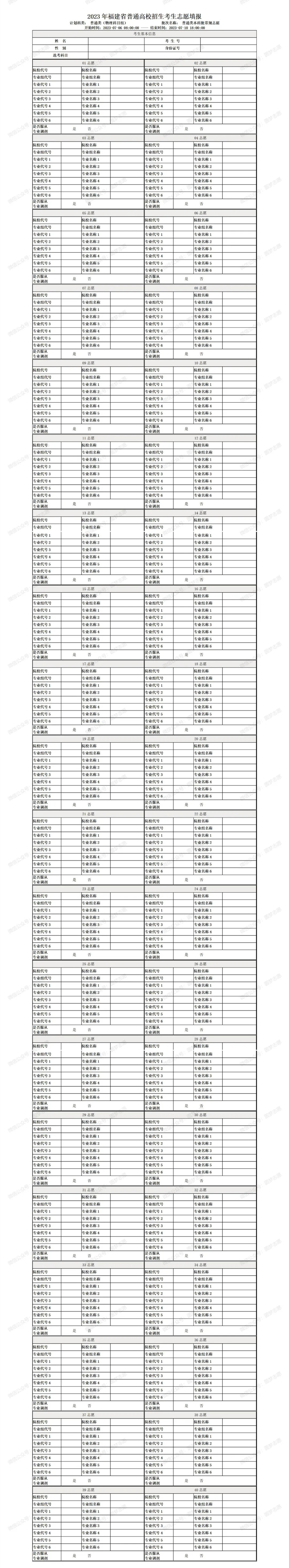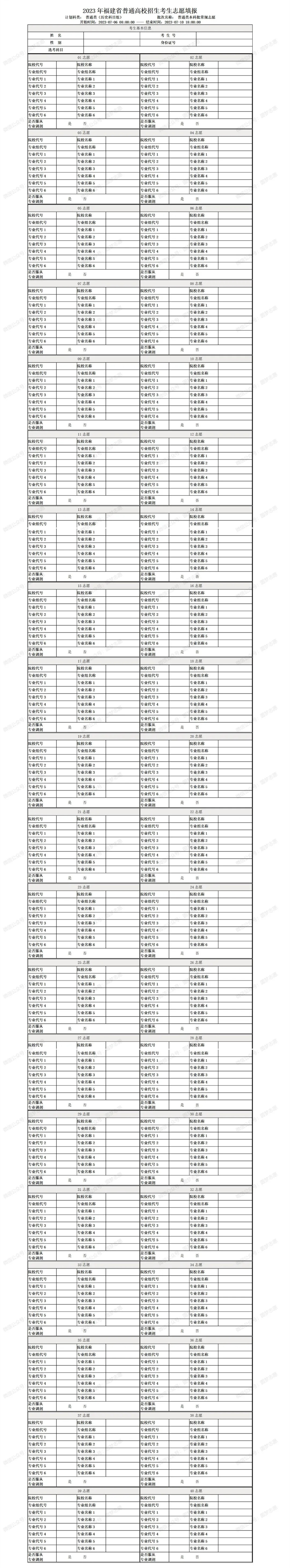 福建常规本科批和专科批均设40个院校专业组志愿,每个院校专业组志愿均设6个专业志愿和是否服从专业调剂栏目。