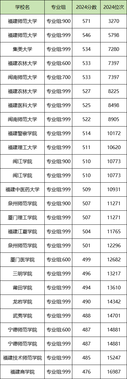 分数线排名最后的公办二本大学是福建商学院999组(476分),除此之外,收分较低的院校还有:福建技术师范学院999组(485分)、宁德师范学院999组(487分)、宁德师范学院600组(487分)、武夷学院999组(488分)。