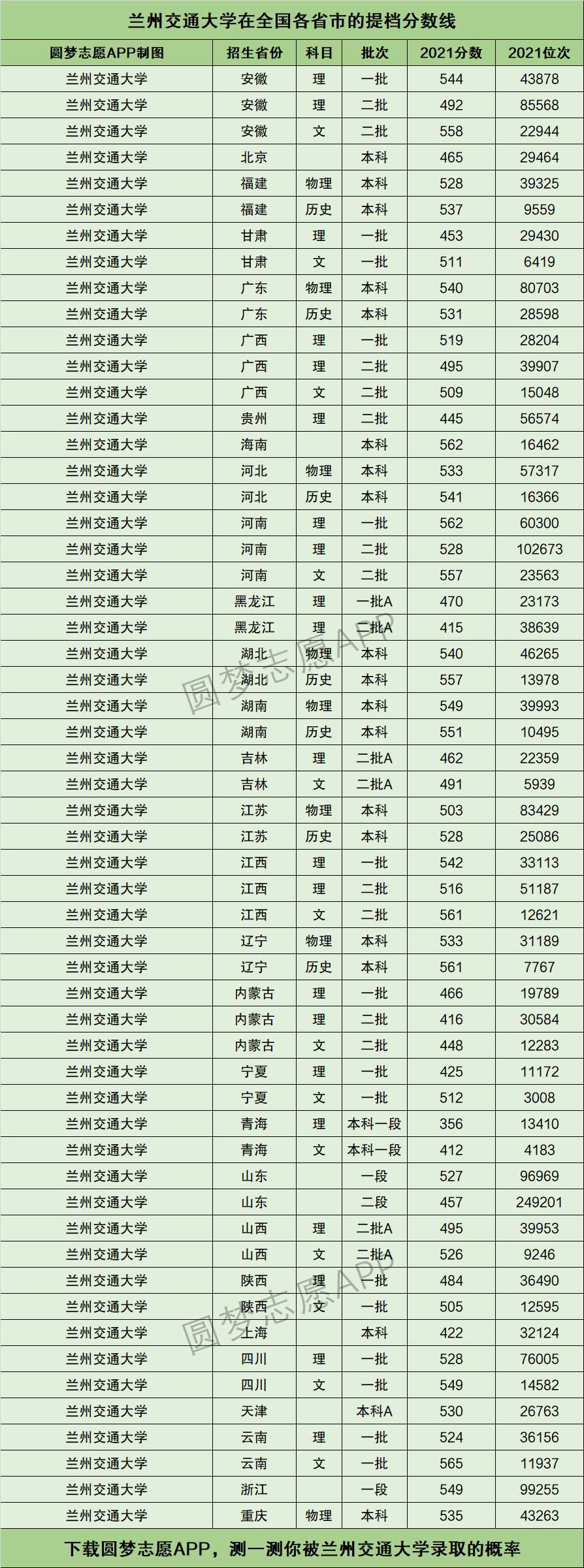 一、兰州交通大学提档线2021年 兰州交通大学位于甘肃省兰州市,所以小编先为大家单独列出了兰州交通大学在甘肃省2021年的提档分数线。 1、文科 兰州交通大学在本科一批的最低提档线为511分,最低位次为6419名。 2、理科 兰州交通大学在本科一批的最低提档线为453分,最低位次为29430名。 如果你想查看:兰州交通大学各专业——近三年的录取分数线和位次。请直接在手机应用市场下载圆梦志愿APP,获取资料。 二、兰州交通大学调档比例 本文将以兰州交通大学2021年本科招生章程为依据,为大家提供兰州交通大学的调档比例。 兰州交通大学根据各省(自治区、直辖市)生源情况确定提档比例,按照顺序志愿投档的批次,调档比例控制在120%以内。按照平行志愿投档的批次,调档比例控制在105%以内。 三、兰州交通大学在全国各省市的提档线汇总 下图为具体的招录数据,同学们在参考时一定不能只看兰州交通大学的最低分,要重点对比兰州交通大学的最低录取位次↓