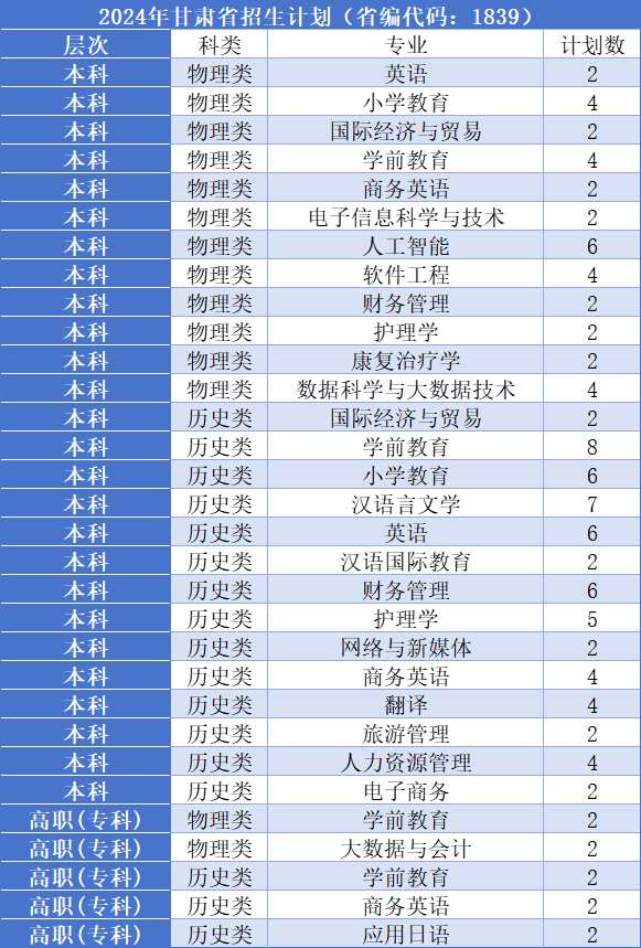 2、在甘肃省共招生10人,专业有大数据与会计、应用日语等。
