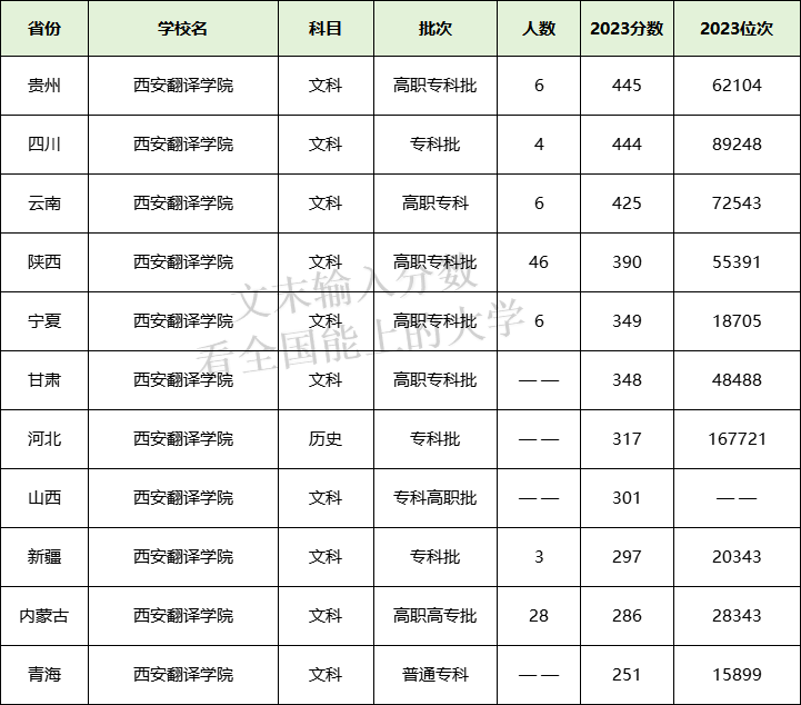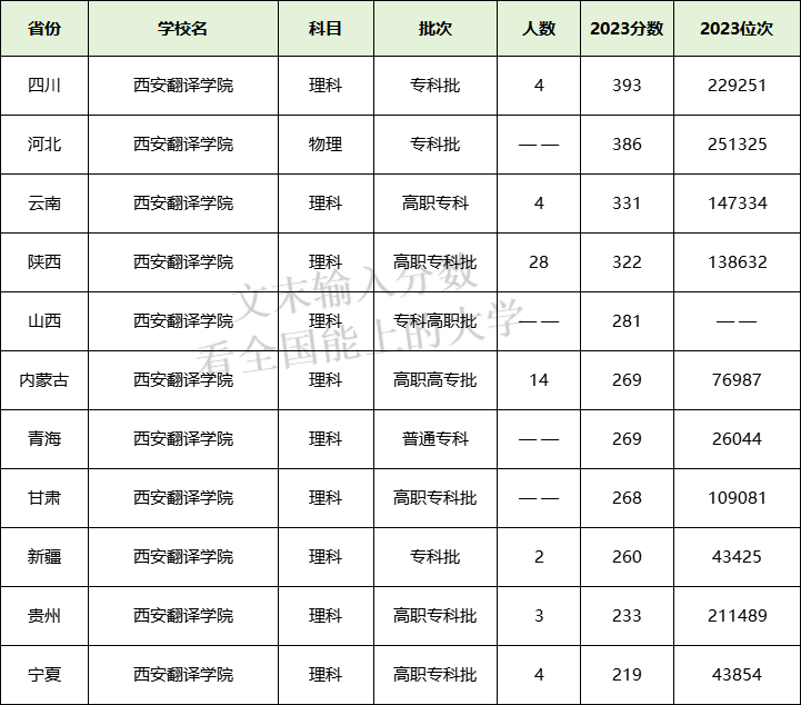 西安翻译学院专科在云南理科最低331分、四川理科最低393分。本期将为大家整理2023年西安翻译学院各省专科分数线,以及2024年在各省的招生计划人数。
