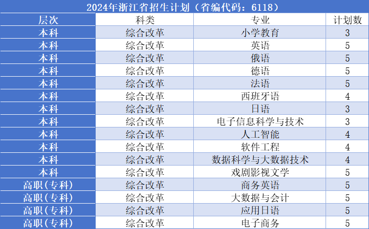 3、在浙江省共招生20人,专业有商务英语、电子商务等。