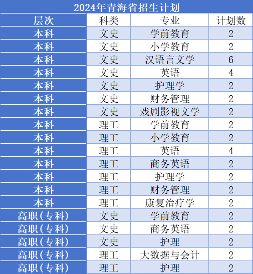 1、在青海省共招生10人,专业有学前教育、商务英语等。
