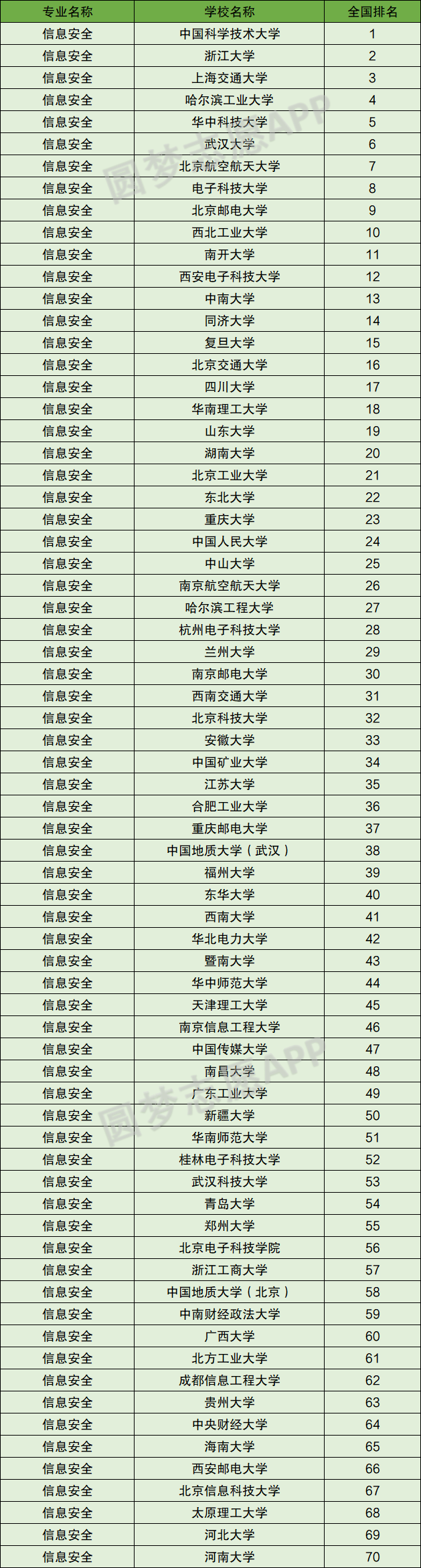 在软科中国大学专业排名中,信息安全专业共有70所大学上榜,在信息安全专业中排名前十的大学为中国科学技术大学、浙江大学、上海交通大学、哈尔滨工业大学、华中科技大学、武汉大学、北京航空航天大学、电子科技大学、北京邮电大学、西北工业大学。