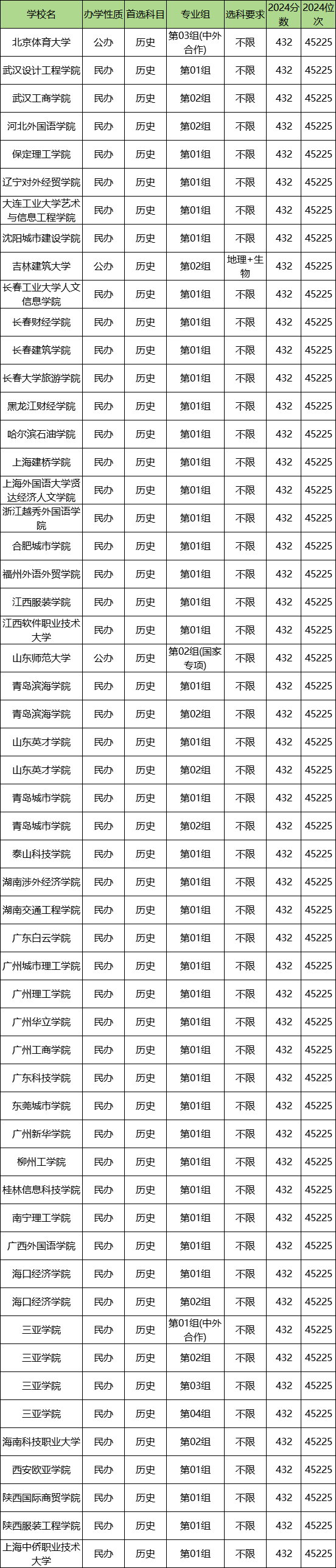 2025年能够选科的地区都不分一本二本,考生们只能知道多少分可以考二本大学,而且各省的录取数据还不一样,以湖北2024年数据为例,历地生最低432分可以考上本科大学,对应的大学有北京体育大学、武汉设计工程学院等。