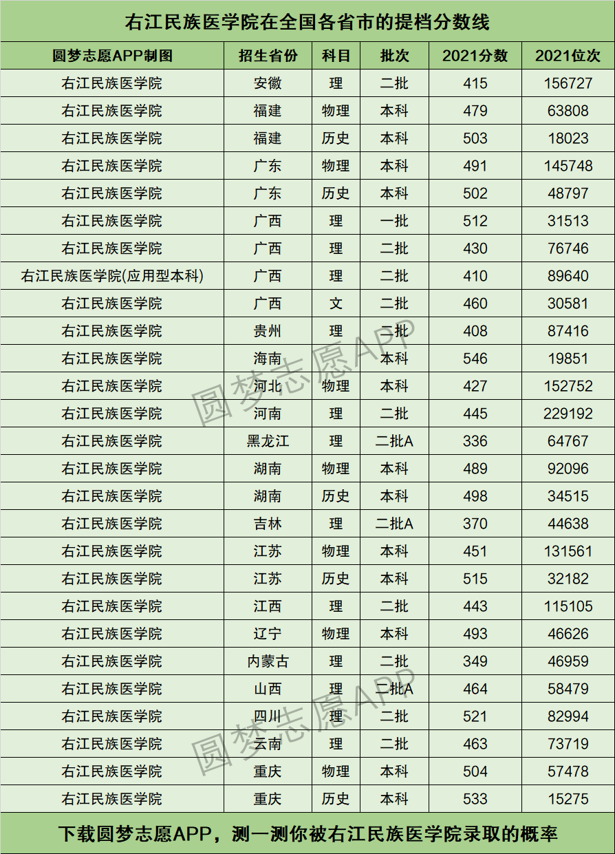 一、右江民族医学院提档线2021年 右江民族医学院位于广西百色市,所以小编先为大家单独列出了右江民族医学院在广西2021年的提档分数线。 1、文科 右江民族医学院在本科二批的最低提档线为460分,最低位次为30581名。 2、理科 右江民族医学院在本科一批的最低提档线为512分,最低位次为31513名。 右江民族医学院在本科二批的最低提档线为430分,最低位次为76746名。 右江民族医学院(应用型本科)在本科二批的最低提档线为410分,最低位次为89640名。 如果你想查看:右江民族医学院各专业——近三年的录取分数线和位次。请直接在手机应用市场下载圆梦志愿APP,获取资料。 二、右江民族医学院在全国各省市的提档线汇总 下图为具体的招录数据,同学们在参考时一定不能只看右江民族医学院的最低分,要重点对比右江民族医学院的最低录取位次↓