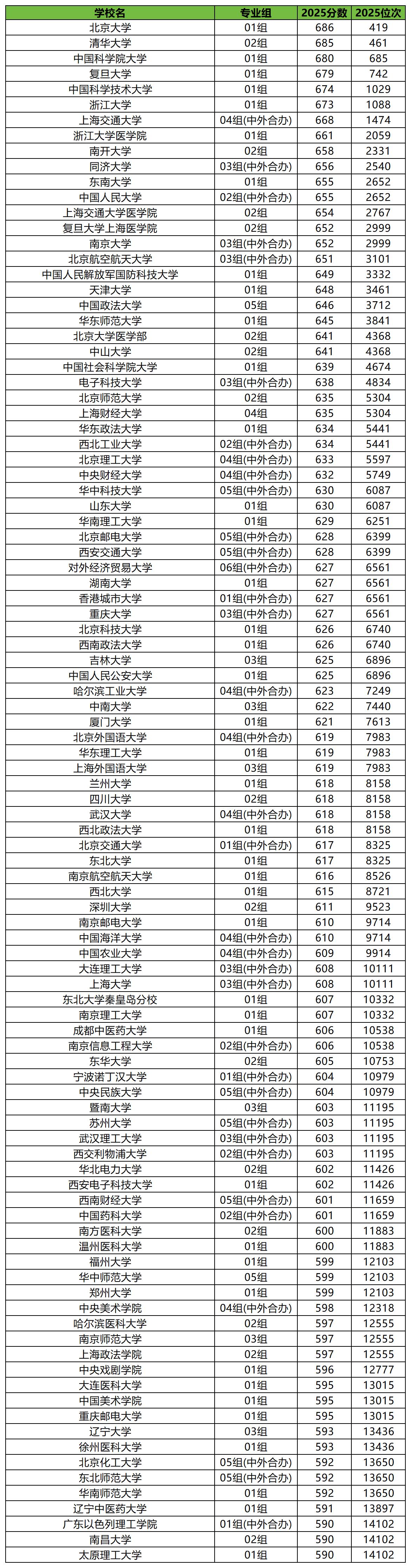 如果想要冲刺清北,考生分数至少要达680分及以上,其中清华大学最低分为685分、北京大学最低分为686分。而该分数仅为学校最低分,热门专业(组)分数门槛或会更高。