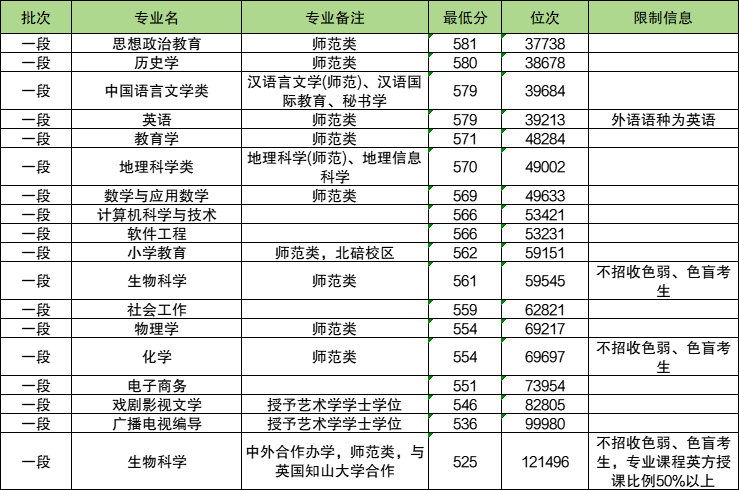 中国语言文学类专业(汉语言文学(师范)、汉语国际教育、秘书学):最低579分。