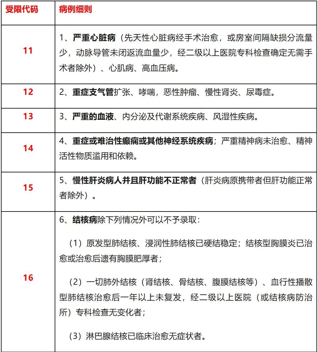 为帮助考生和家长全面了解相关政策,本文依据系统梳理了体检受限代码(分为不予录取、限制录取、不宜就读三大类),并在此基础上,整理了部分高校在招生章程中对身体条件的补充要求,供考生填报志愿时参考。