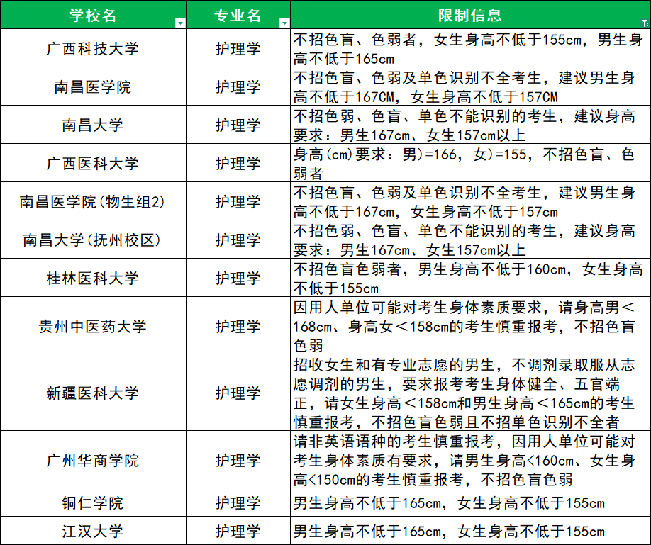 此外,同一专业不同院校对身体条件的要求也不同,比如2025年广西科技大学护理学专业招生要求女生身高不低于155cm,南昌医学院则要求不低于157cm。