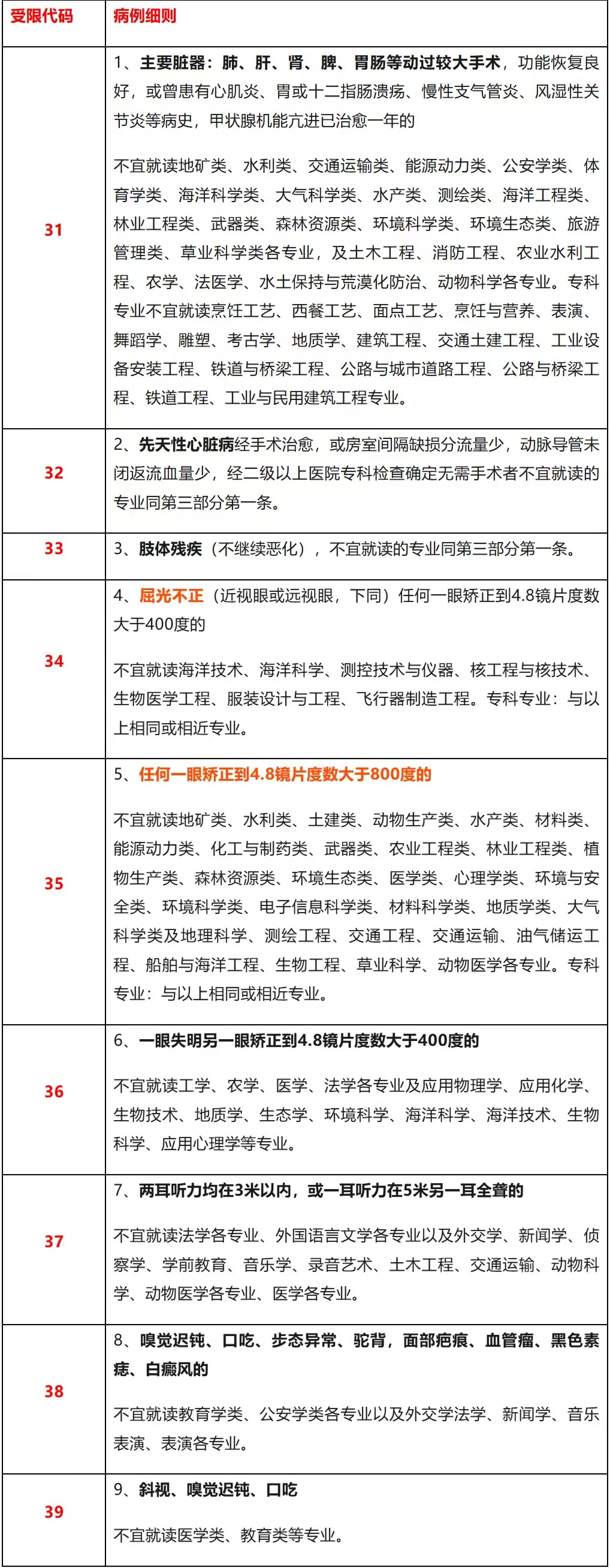 33:肢体残疾(不继续恶化),不宜就读专业同31。