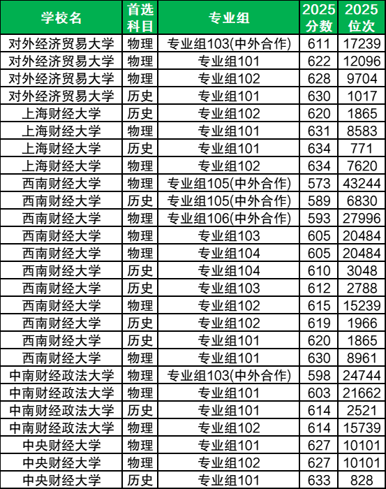 2025年211财经类大学在不同省份、不同科类招生的录取分数线会有差异,为方便对比各院校的收分门槛,这里以四川省为例,为大家列举这5所院校2025年各专业组的最低分情况。