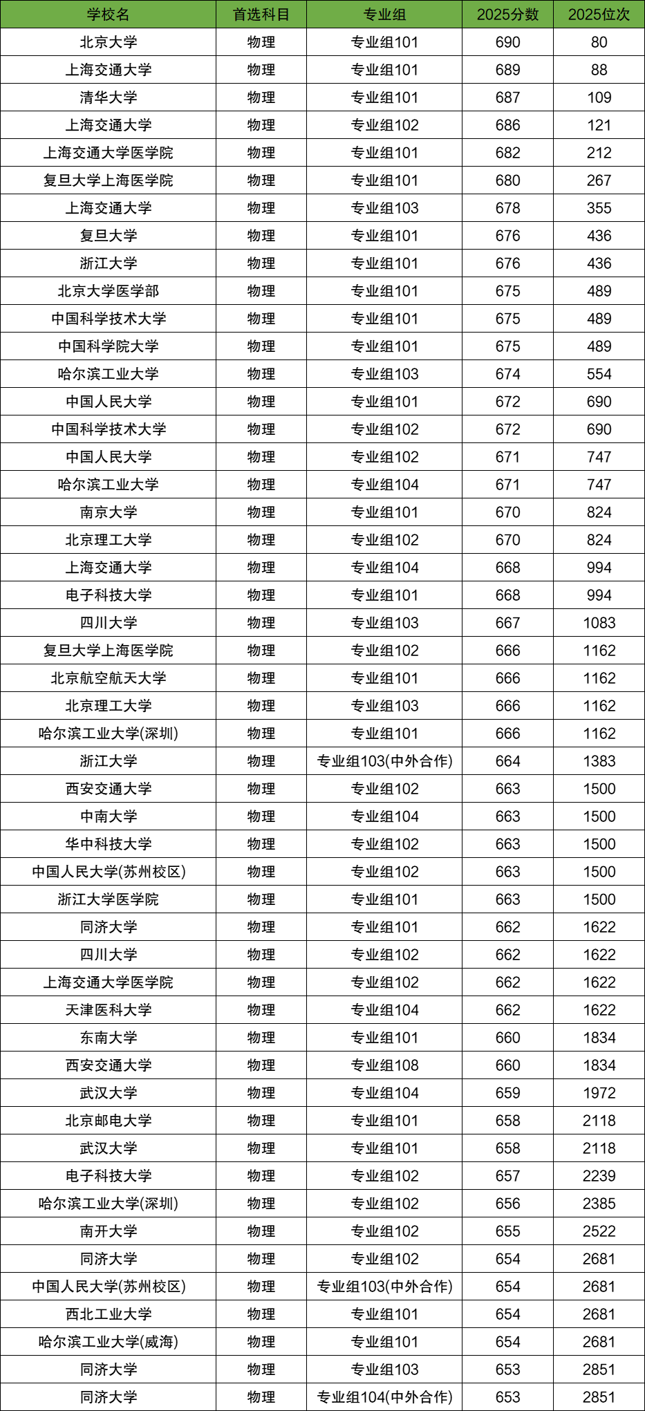 下面是2025年各本科大学在四川物理类的录取分数线一览表(供参考):