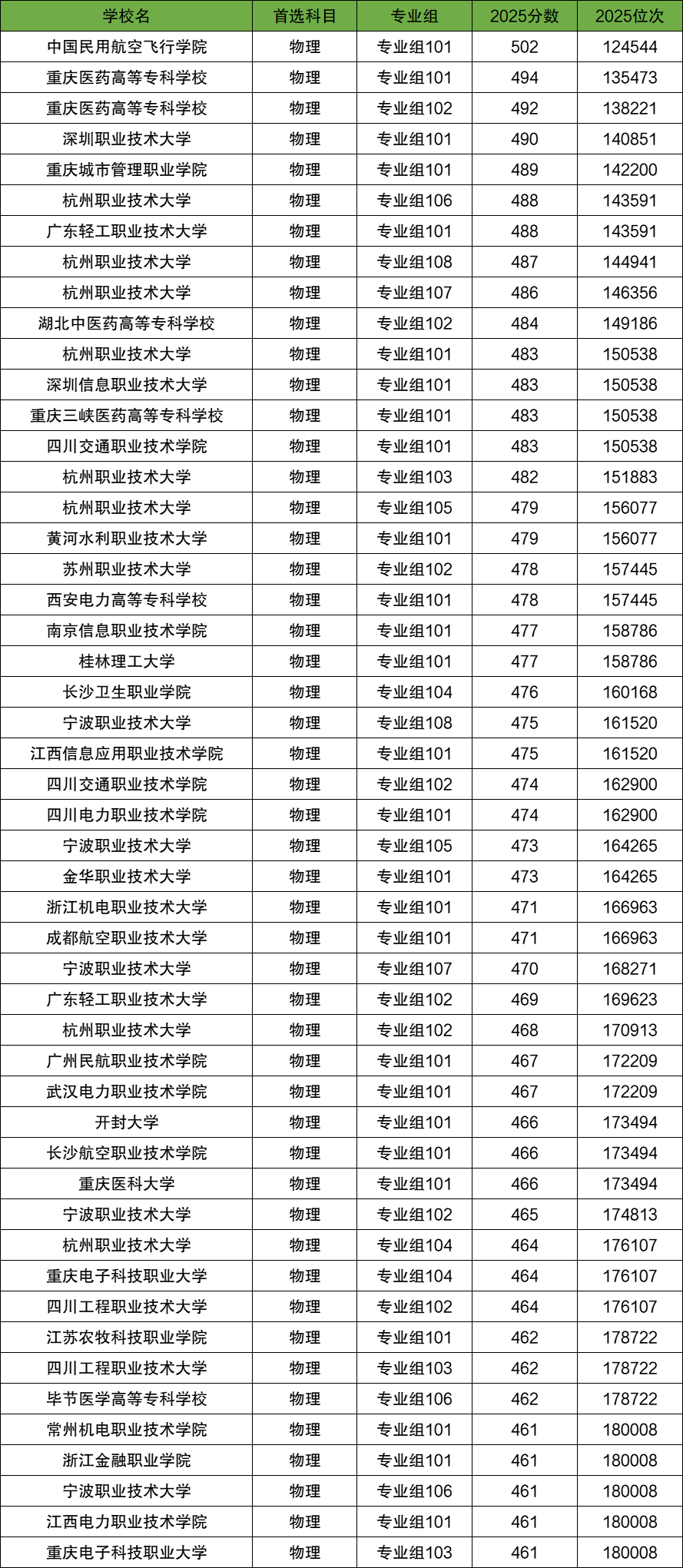 2025年在四川物理类,录取分数最高的专科院校是中国民用航空飞行学院专业组101,最低录取分数为502分;录取分数超过490分的还有重庆医药高等专科学校专业组101(494分)、重庆医药高等专科学校专业组102(492分)、深圳职业技术大学专业组101(490分)。