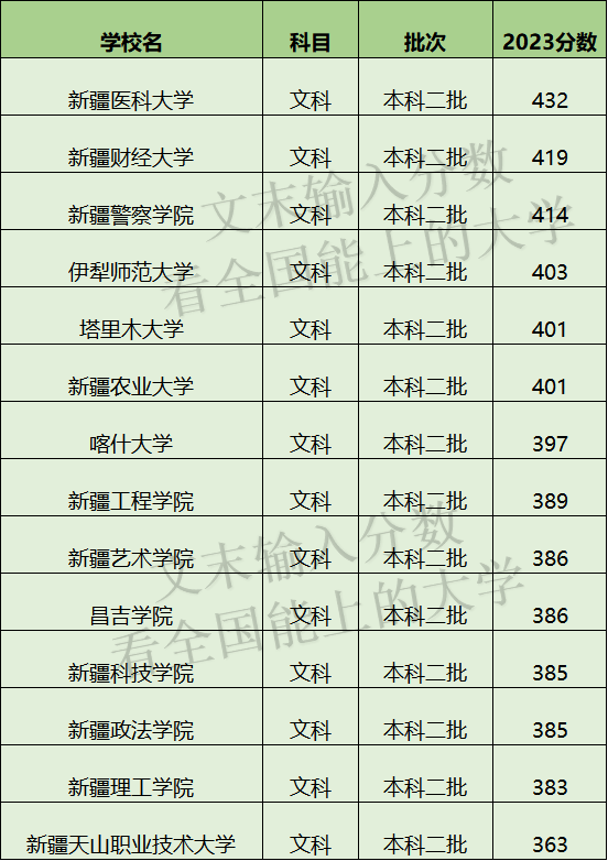 在新疆文科中,新疆所有二本大学分数最高最难考的大学为新疆医科大学、新疆财经大学、新疆警察学院、伊犁师范大学、塔里木大学,对应最低分数为432分、419分、414分、403分、401分。